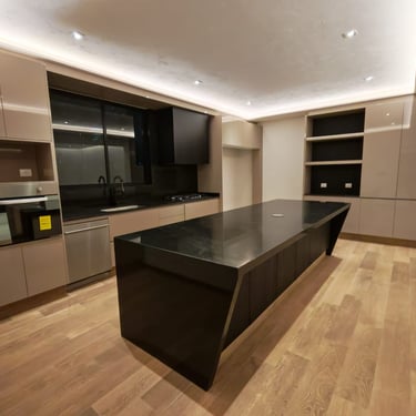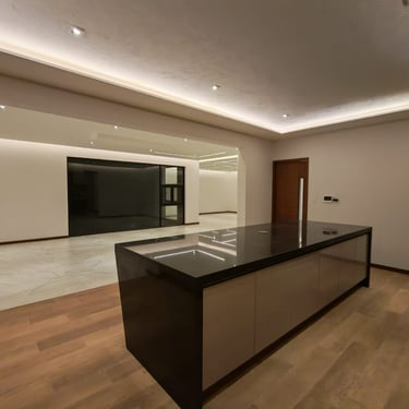 Cocina con diseño personalizado, barra desayunadora, alacena y pequeña cava decorada con azulejos de Talavera.